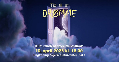Fællesshow - Husk at sætte sæt kryds ved datoen 10. april, hvor Kulturskolen præsenterer årets fællesforestilling ”Tid til at drømme”. Billetsalget er i gang. Køb billet til showet - her kan du også tilkøbe aftensmad inden showet - menuen står på byg-selv burger.