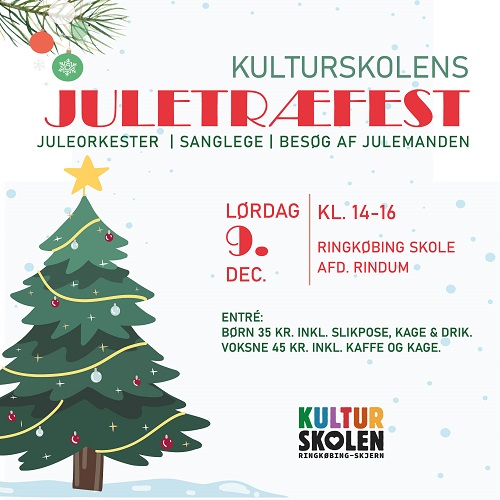 Traditionen tro byder Kulturskolen op til dans rundt om juletræet til årets juletræsfest på lørdag den 9/12 kl. 14-16 på Skoletorvet ved Kulturskolen i Ringkøbing, Rindumvej 1. Julemanden kommer på besøg og musikken leveres af Kulturskolens eget Nisseorkester. Der er kage, saft og kaffe/the og slikposer til børnene. Billetter købes på forhånd på place2book. Pris 45 kr. for voksne (fra 16 år) og 35 kr. for børn + gebyr.