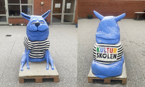 Vi har en ny maskot - en blå kulturhund lavet af vores kreative keramik- og billedkunstlærer Gitte Jean Kjærgaard.