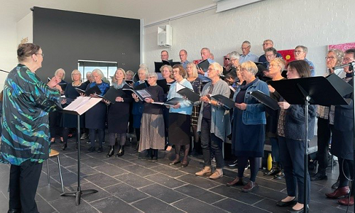 På billedet ses Rindumkoret ledet af korets første dirigent, Marie Gorm Jakobsen. Koret ledes i dag af Ingeborg Hult Torstensson.